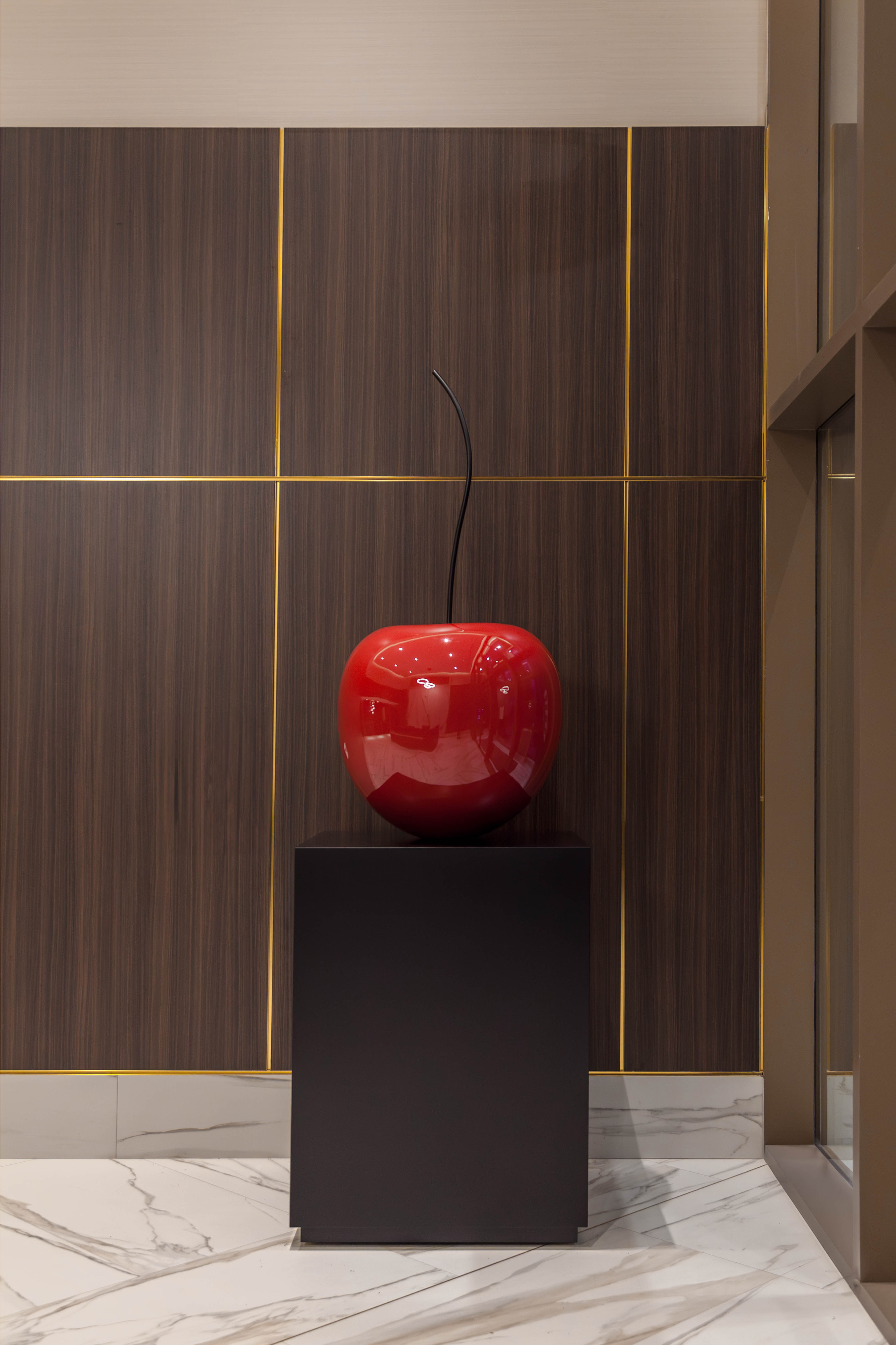Our studio was commissioned by Michael London Design to create two bespoke lacquered cherry sculptures for two private residence lobbies. Each cherry was expertly hand-carved, coated in plaster, and carefully sanded to achieve a seamless surface. Finished with a striking high-gloss lacquer, the sculptures sit on custom-designed plinths, adding a bold yet sophisticated touch to the refined lobby interiors.