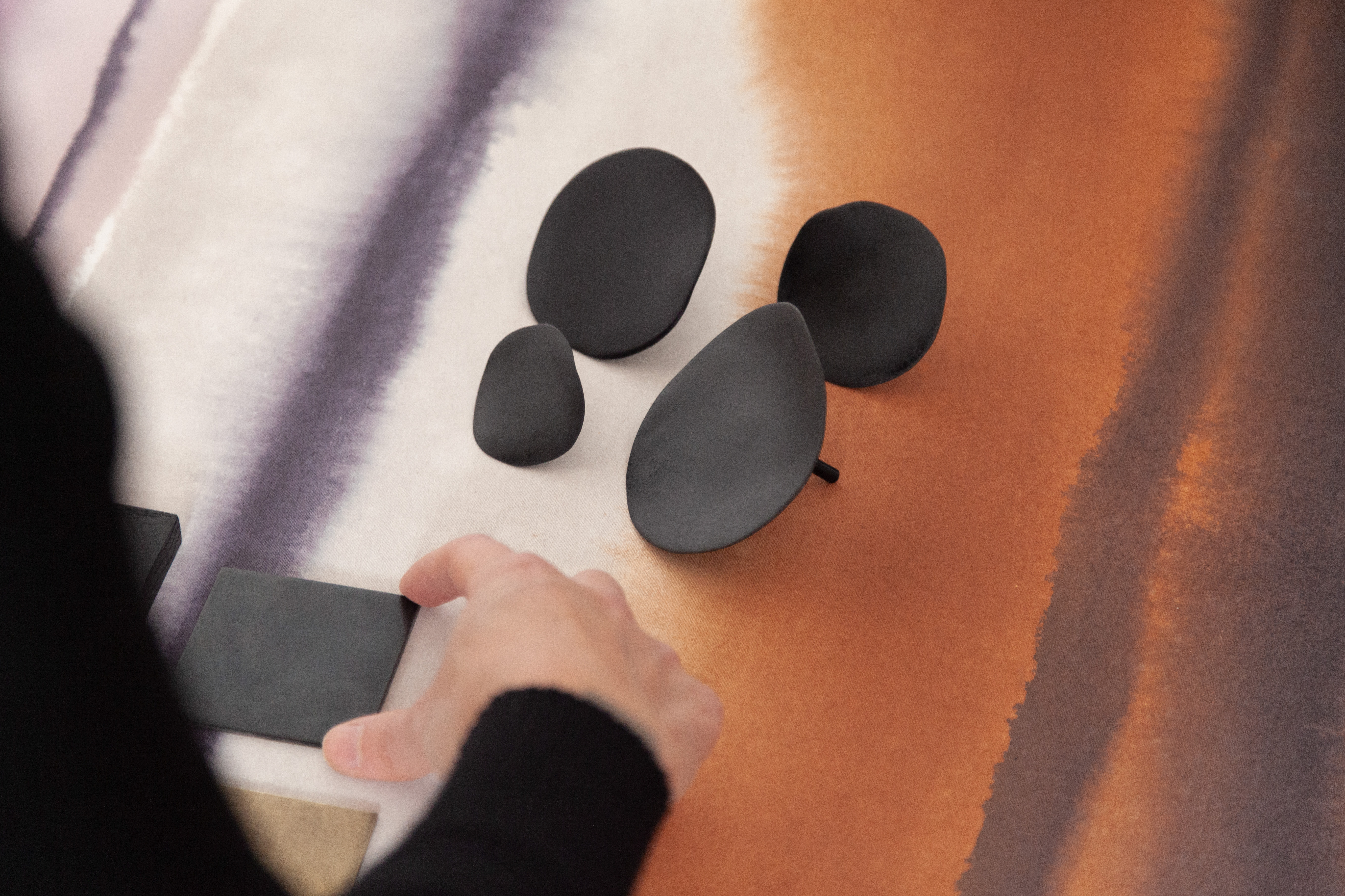 In the signature suites, sculptural works bring scale and presence. Canopies of hand-formed metal fins suspended from the bedroom ceilings evoke a sense of lightness and motion. Hand-turned wood and brass sculptural columns rise floor to ceiling within the niches, bringing warmth and tactility to the space, while a dimensional installation of vertical forms in a painterly custom palette cascades across the dining wall, transitioning from deep browns to warm ambers and soft neutrals. Hand-crafted ceramic petals introduce another layer of detail, their irregular forms casting shifting shadows across custom panels. Together, these works celebrate materiality, craftsmanship, and scale, and reference the mid-century modern sensibility that defines the property’s interiors, transforming the hotel into a layered and memorable guest experience.