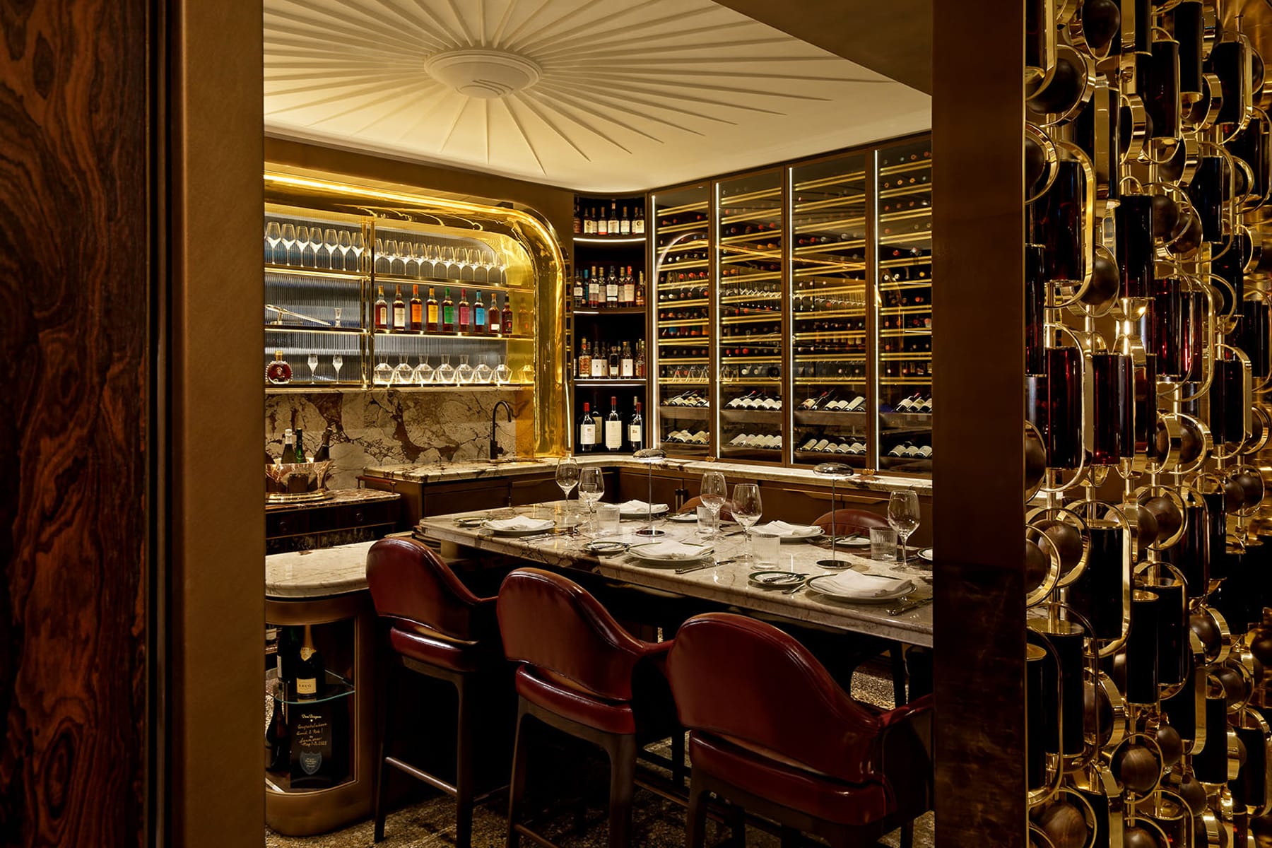 The wine room offers a more intimate counterpart: a refined composition emanating from a custom-engraved medallion, echoing the grandeur of the main dining feature at a personal scale. Inspired by the warmth of a Tuscan sunset, both installations transform through light, shadow, and timeless craft.